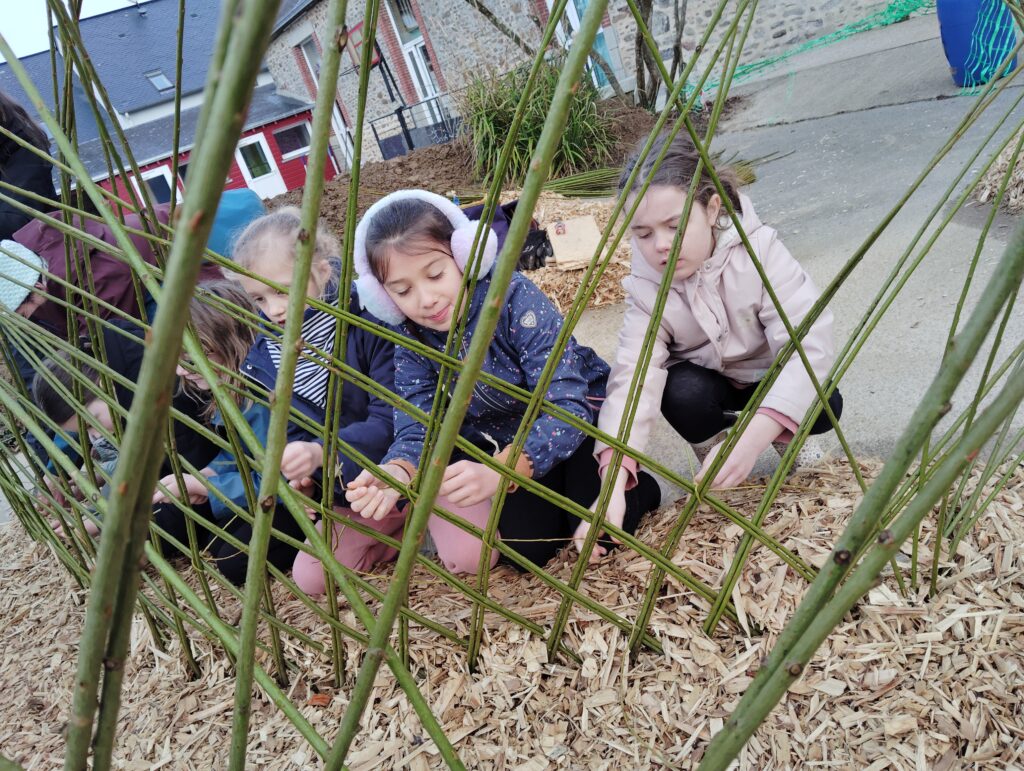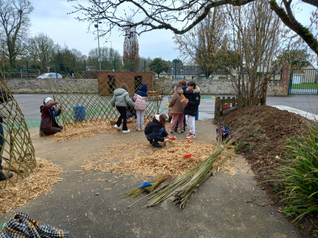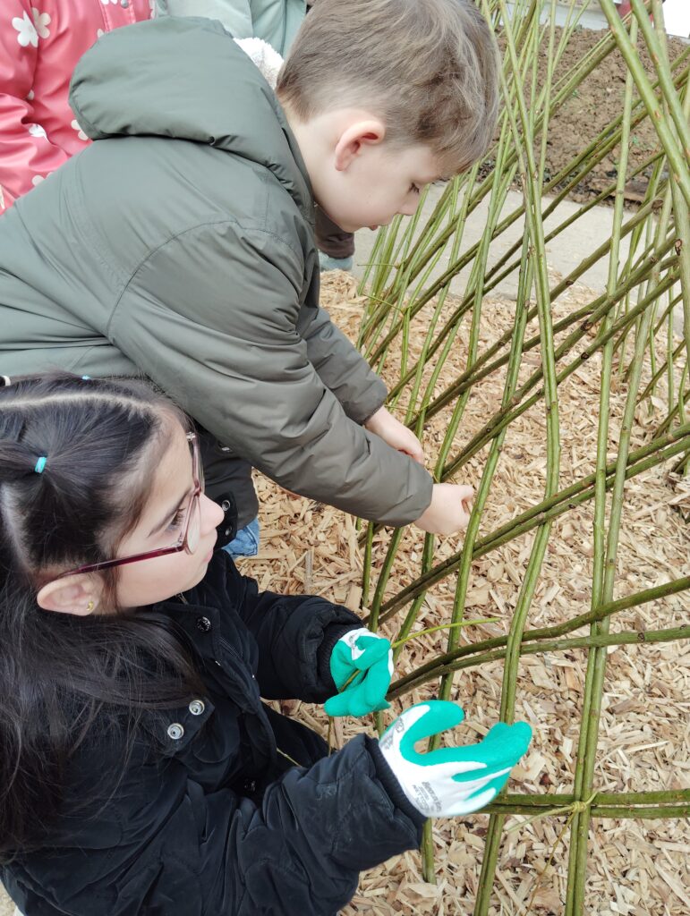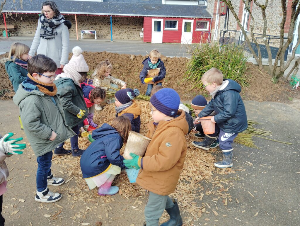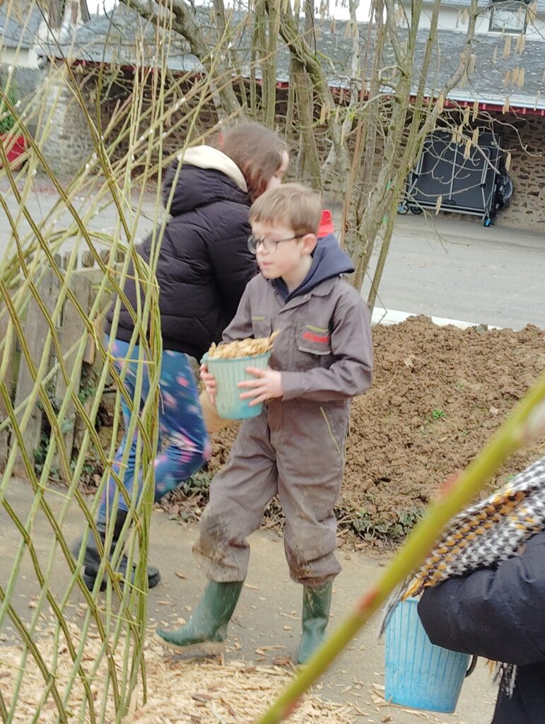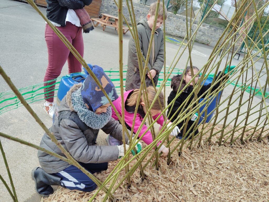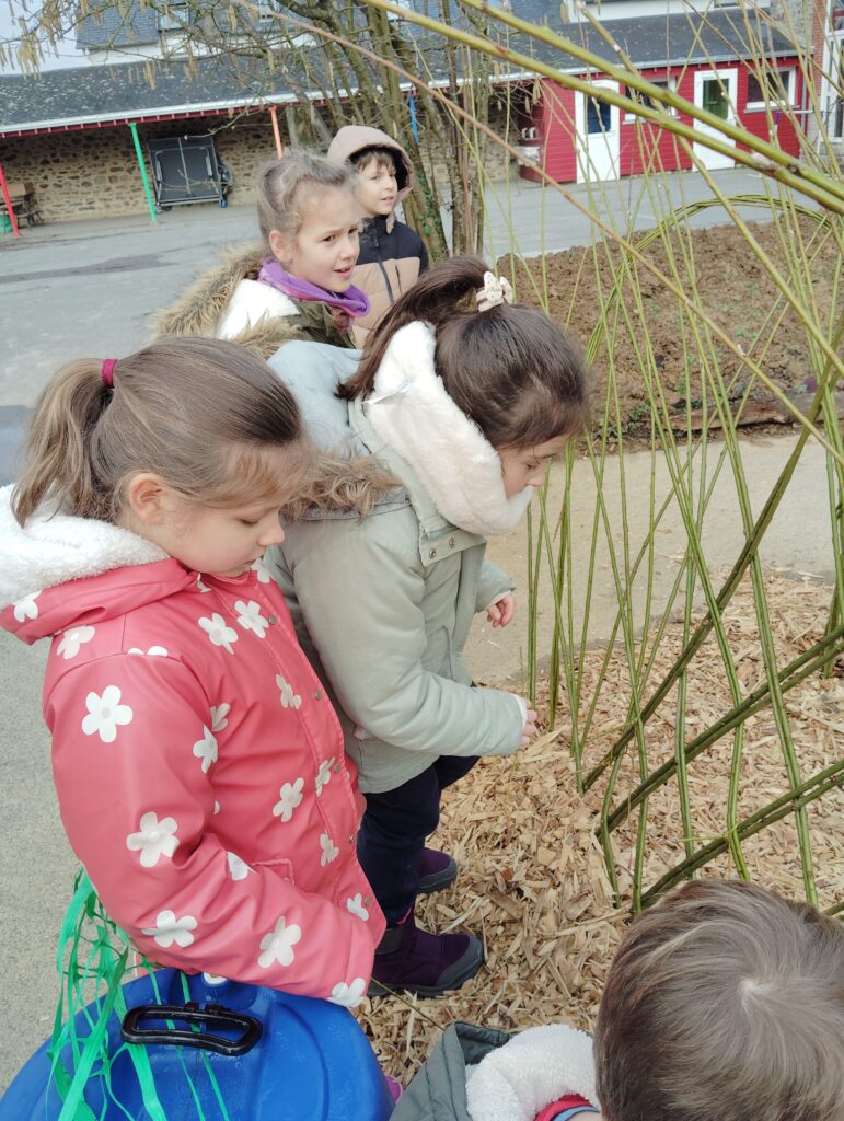 L’intérêt d’un espace végétalisé plus grand était aussi au cœur de la réflexion. Les parents de l’APEL-OGEC se sont mobilisés une première fois en octobre pour préparer la cour à ce changement avecc le décroutage du goudron ! Puis ce samedi, accompagnés de l’entreprise Fournaise, ils ont commencé la plantation d’osier, le bois tendre de l’année du saule.. Les enfants ont pris plaisir à terminer ce travail en échangeant avec les paysagistes.