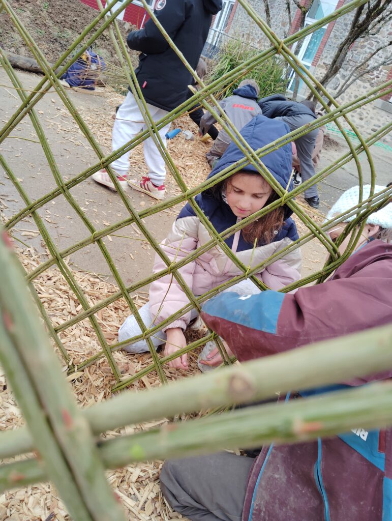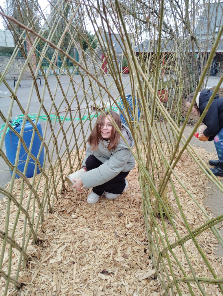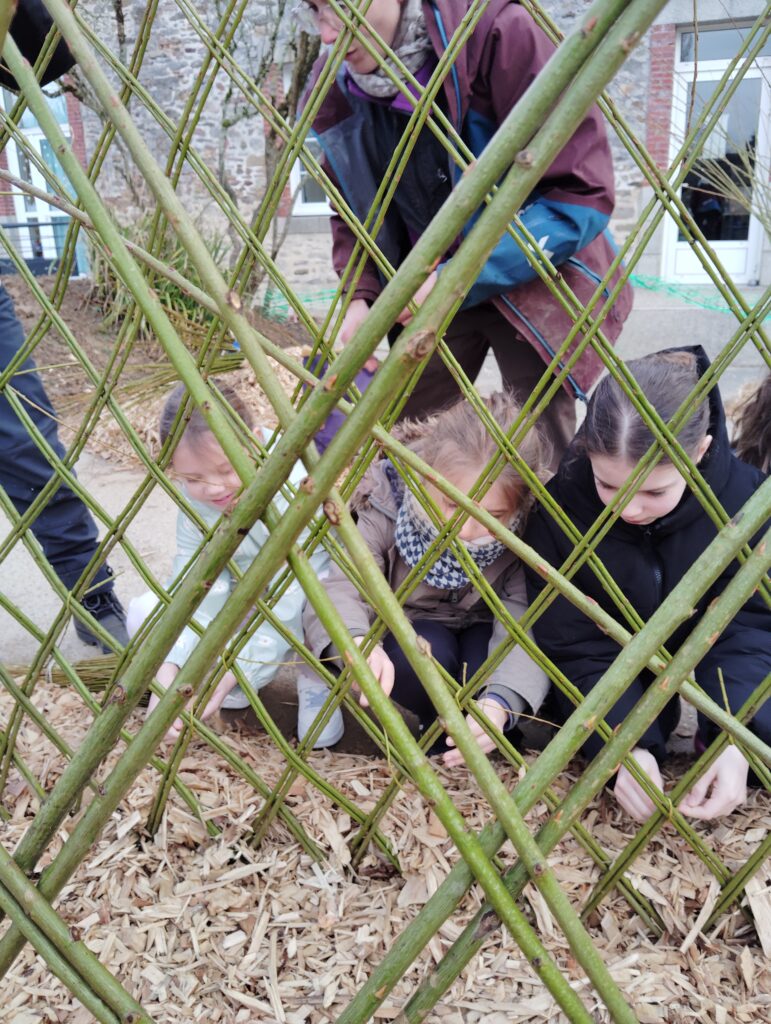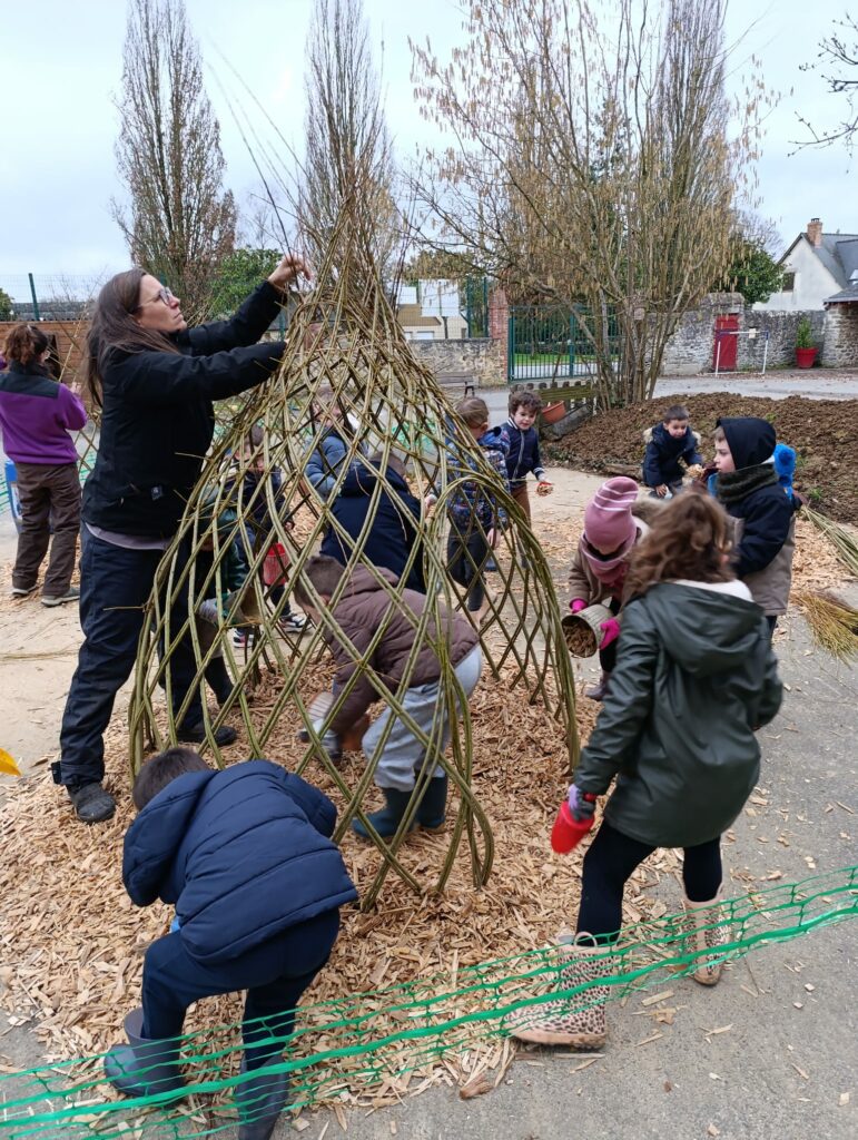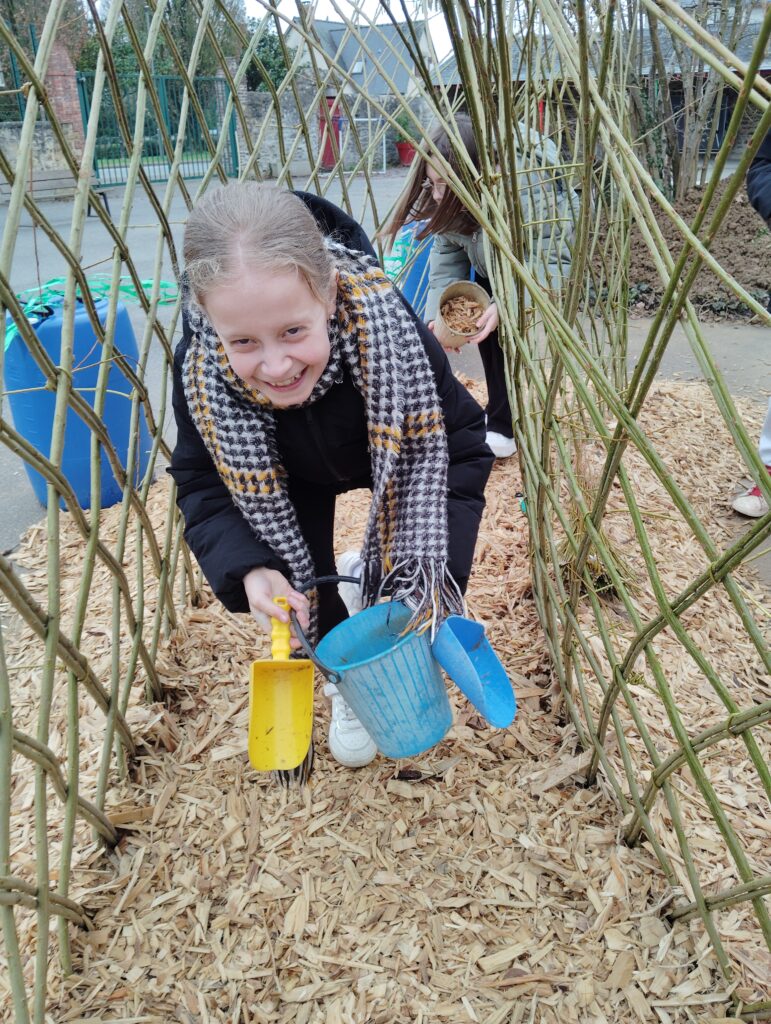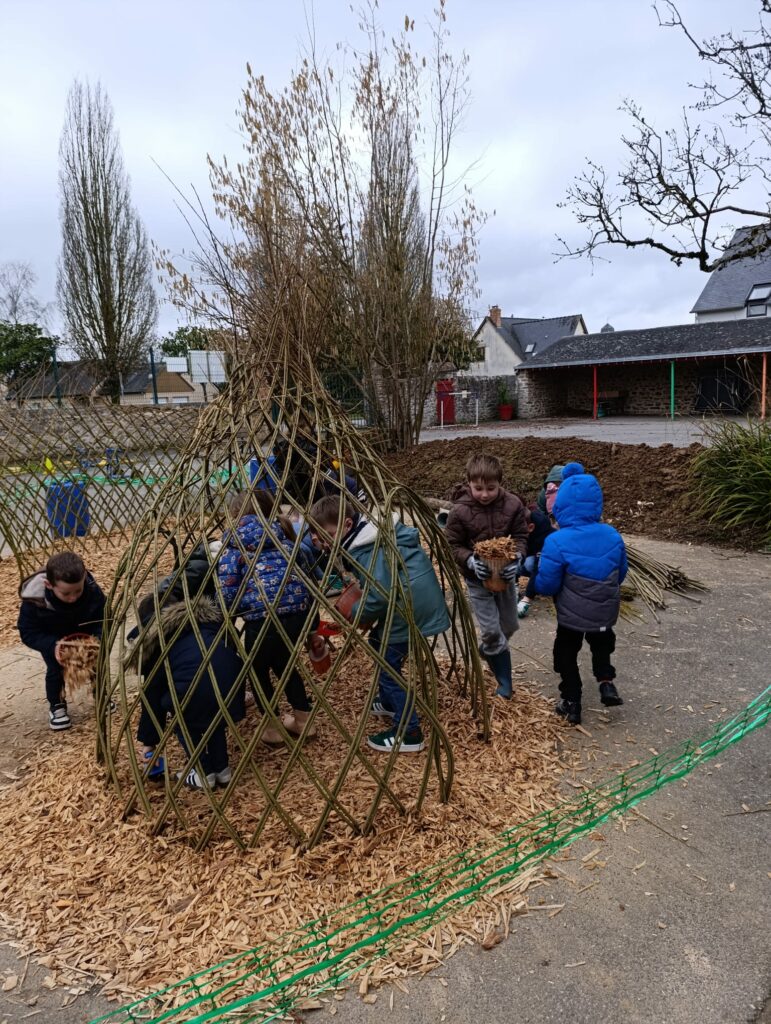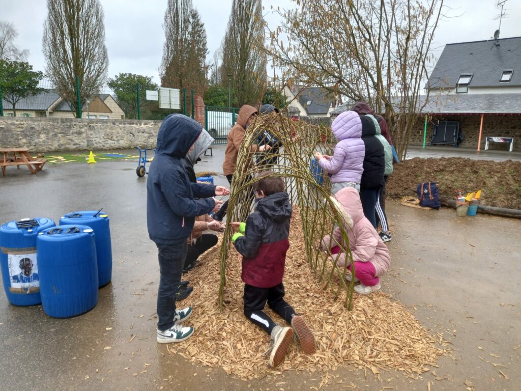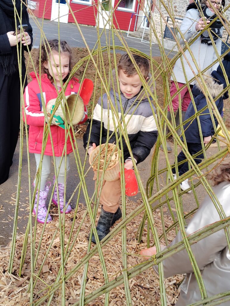 L’intérêt d’un espace végétalisé plus grand était aussi au cœur de la réflexion. Les parents de l’APEL-OGEC se sont mobilisés une première fois en octobre pour préparer la cour à ce changement avecc le décroutage du goudron ! Puis ce samedi, accompagnés de l’entreprise Fournaise, ils ont commencé la plantation d’osier, le bois tendre de l’année du saule.. Les enfants ont pris plaisir à terminer ce travail en échangeant avec les paysagistes.