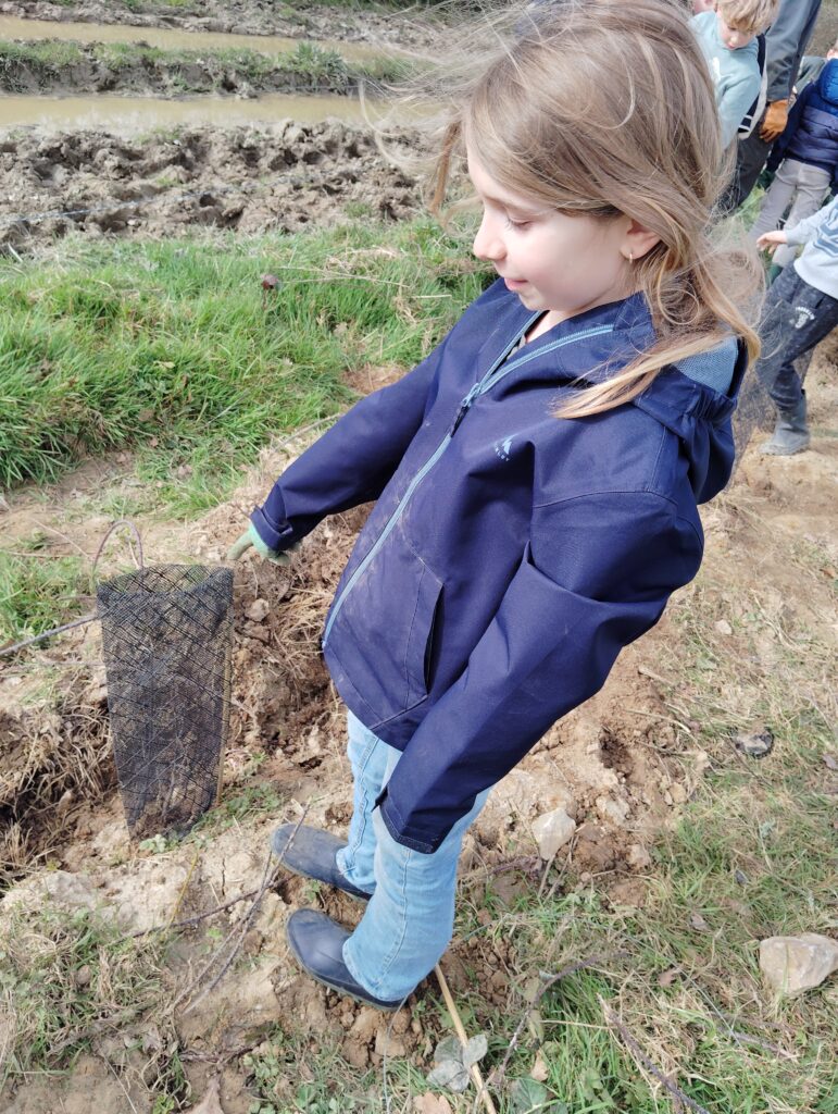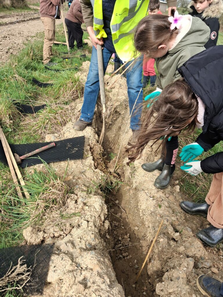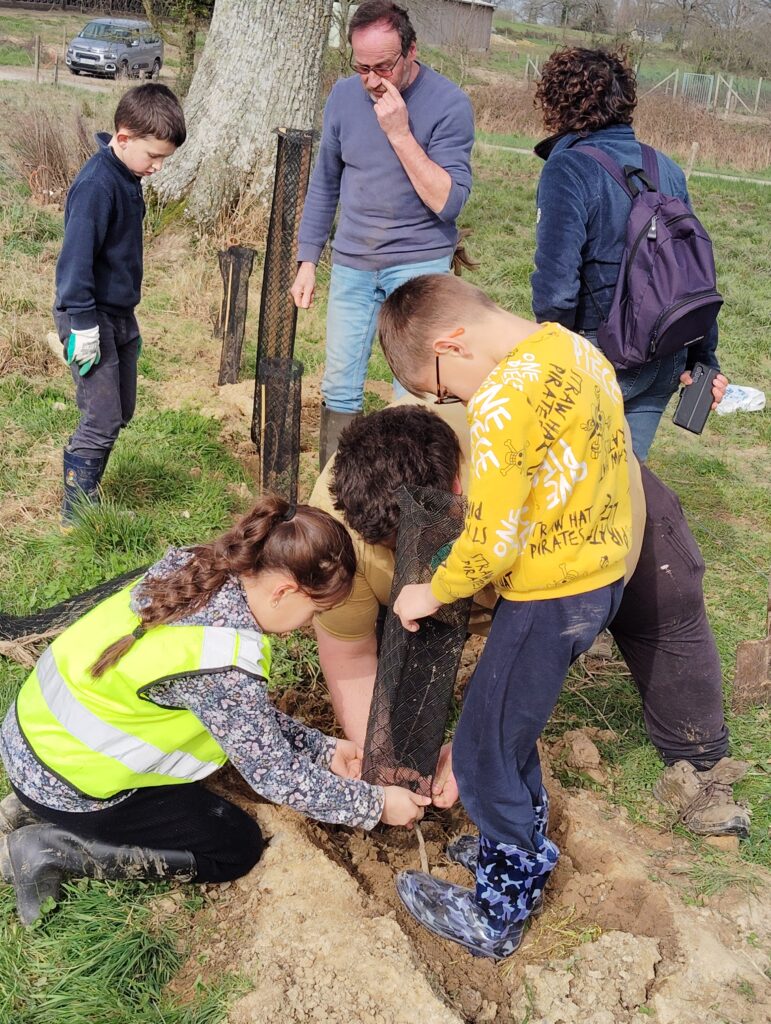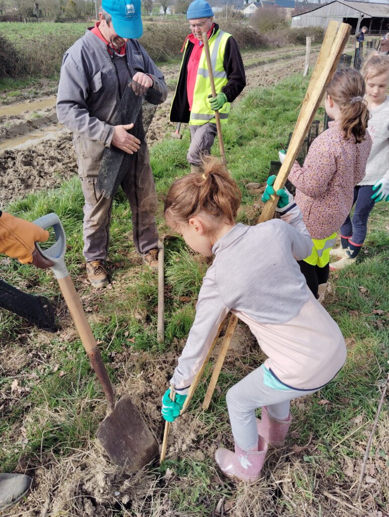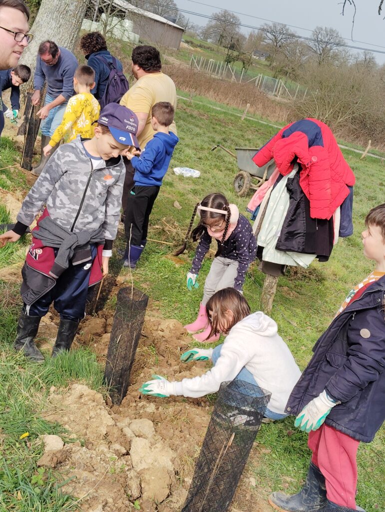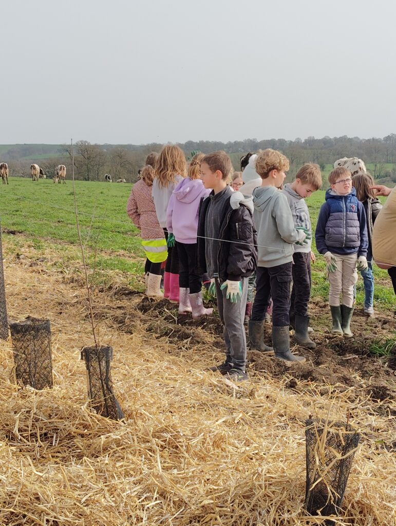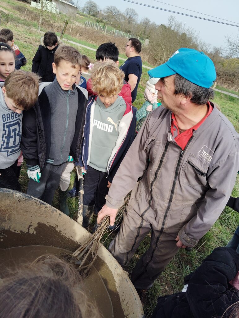 Les enfants de CE et CM ont été accueillis par la famille Gobé, aux Grandes Métairies, afin de planter une haie composée de différentes essences d’arbres : orme, frêne, châtaignier, aulne, merisier, bouleau, charme… Après avoir écouté les explications de Monsieur Gobé sur le rôle des haies, ils ont participé aux différentes étapes : mélanger les racines dans l’eau et la bouse de vache, véritable nutriment, creuser, planter, positionner le filet de protection contre les prédateurs et le fixer dans la terre avec les tuteurs…