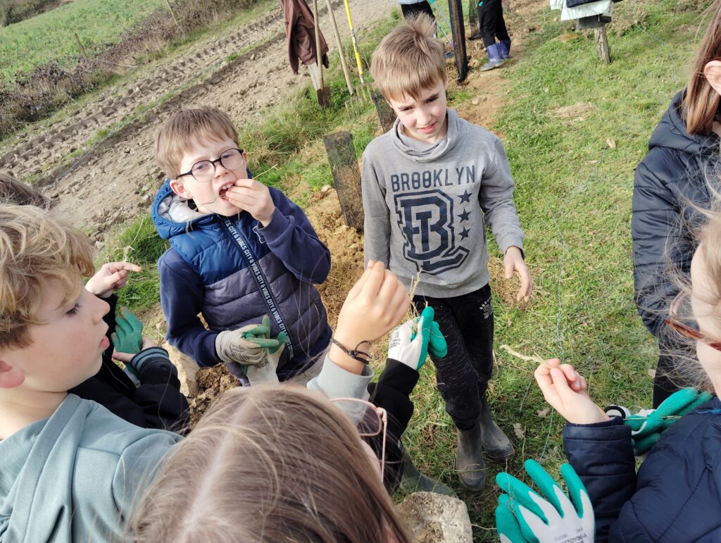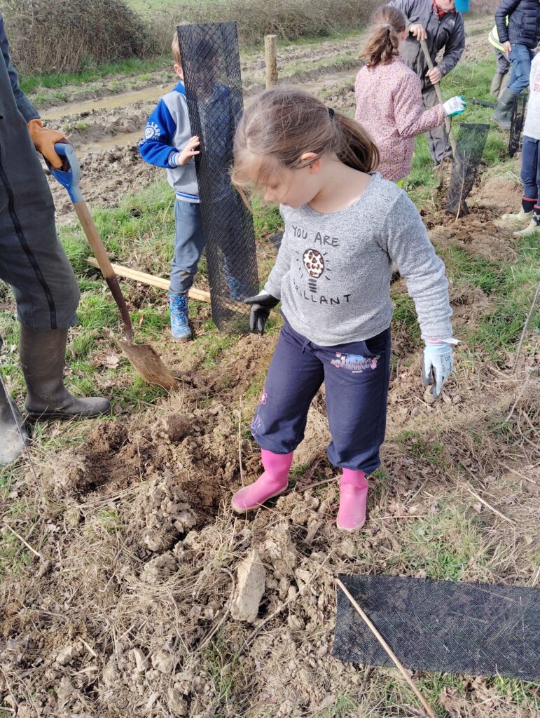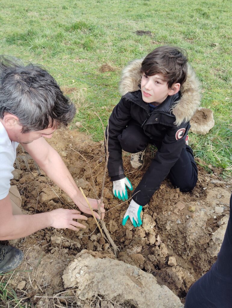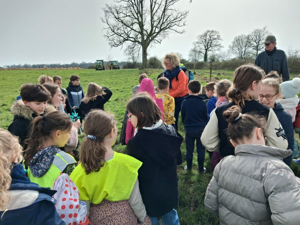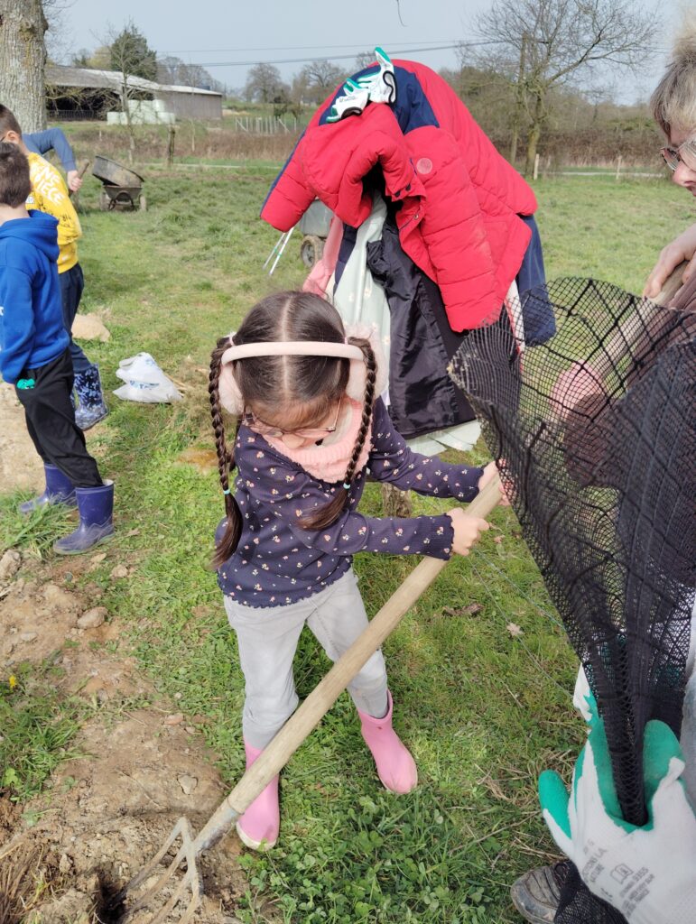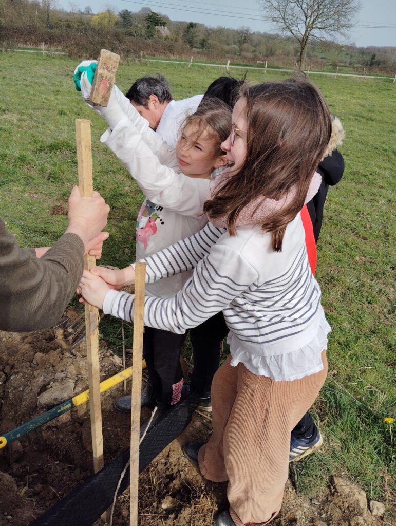 Les enfants de CE et CM ont été accueillis par la famille Gobé, aux Grandes Métairies, afin de planter une haie composée de différentes essences d’arbres : orme, frêne, châtaignier, aulne, merisier, bouleau, charme… Après avoir écouté les explications de Monsieur Gobé sur le rôle des haies, ils ont participé aux différentes étapes : mélanger les racines dans l’eau et la bouse de vache, véritable nutriment, creuser, planter, positionner le filet de protection contre les prédateurs et le fixer dans la terre avec les tuteurs…