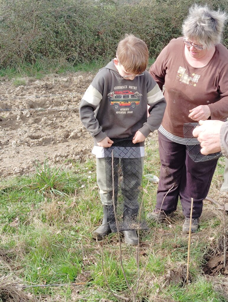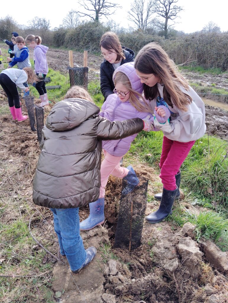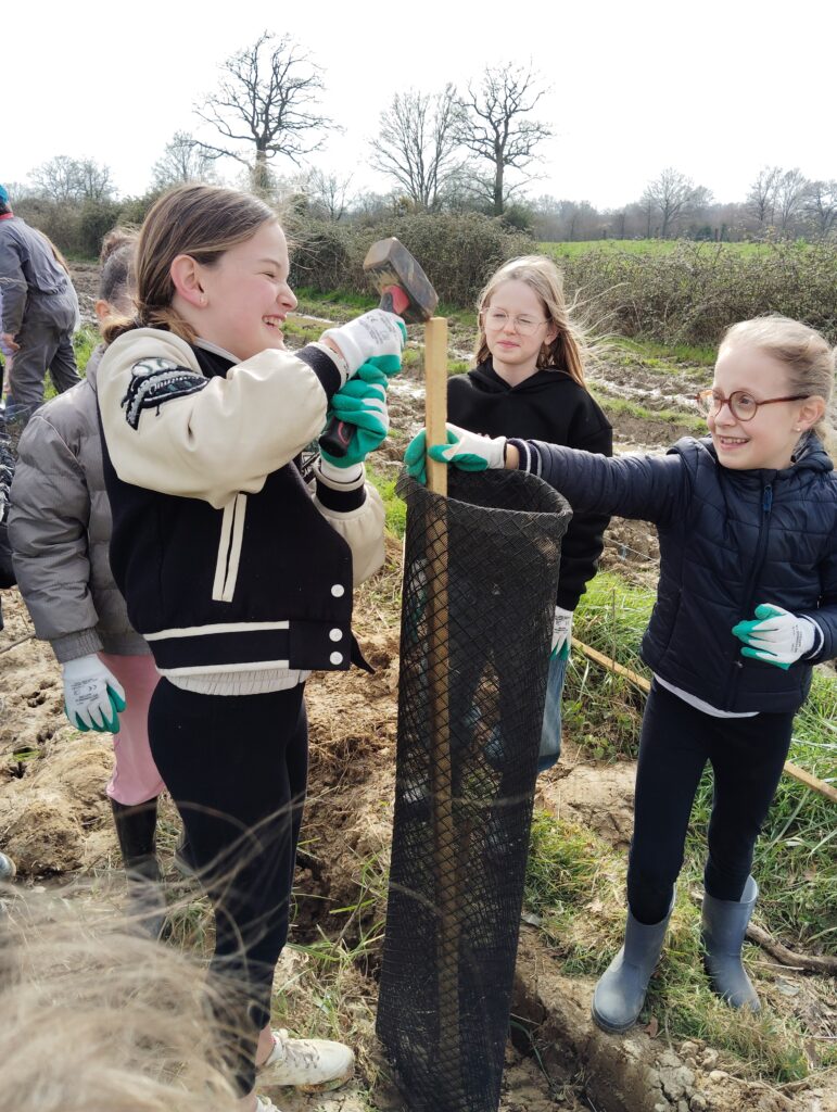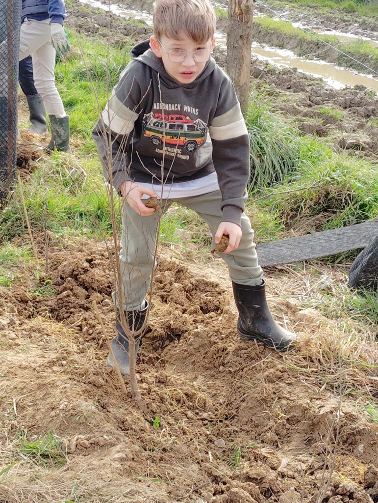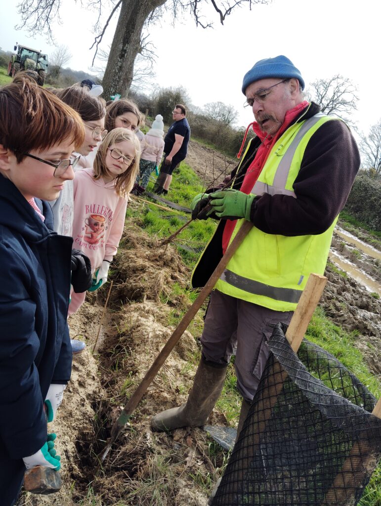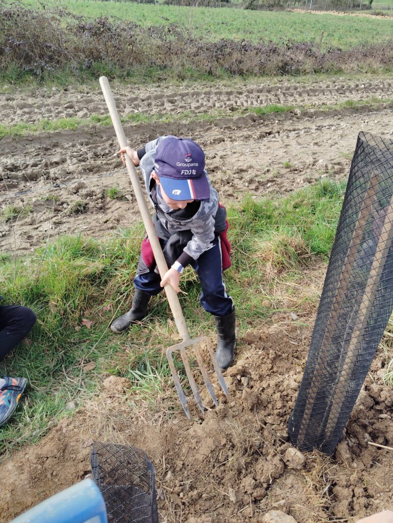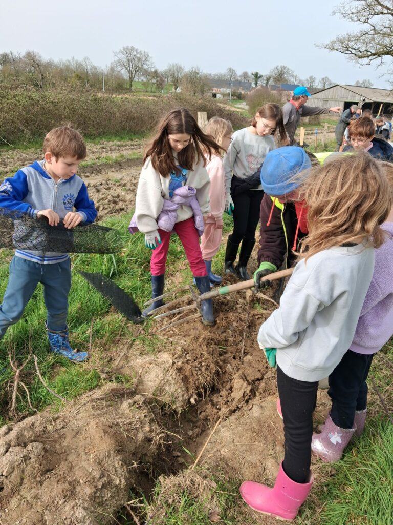 Les enfants de CE et CM ont été accueillis par la famille Gobé, aux Grandes Métairies, afin de planter une haie composée de différentes essences d’arbres : orme, frêne, châtaignier, aulne, merisier, bouleau, charme… Après avoir écouté les explications de Monsieur Gobé sur le rôle des haies, ils ont participé aux différentes étapes : mélanger les racines dans l’eau et la bouse de vache, véritable nutriment, creuser, planter, positionner le filet de protection contre les prédateurs et le fixer dans la terre avec les tuteurs…