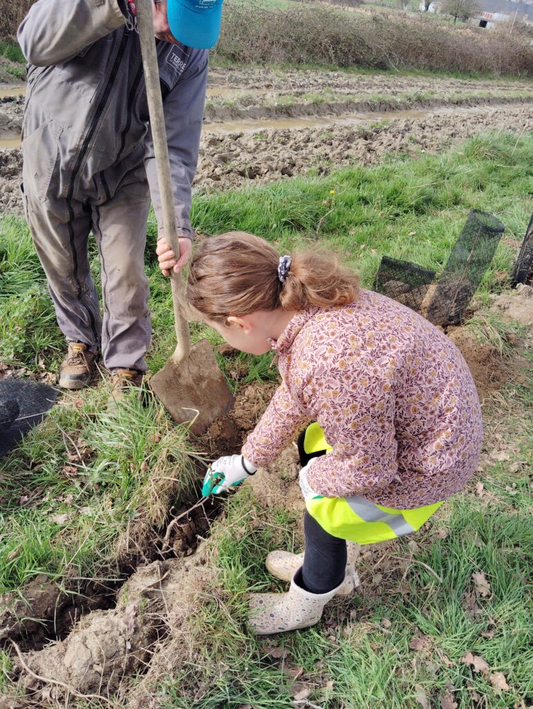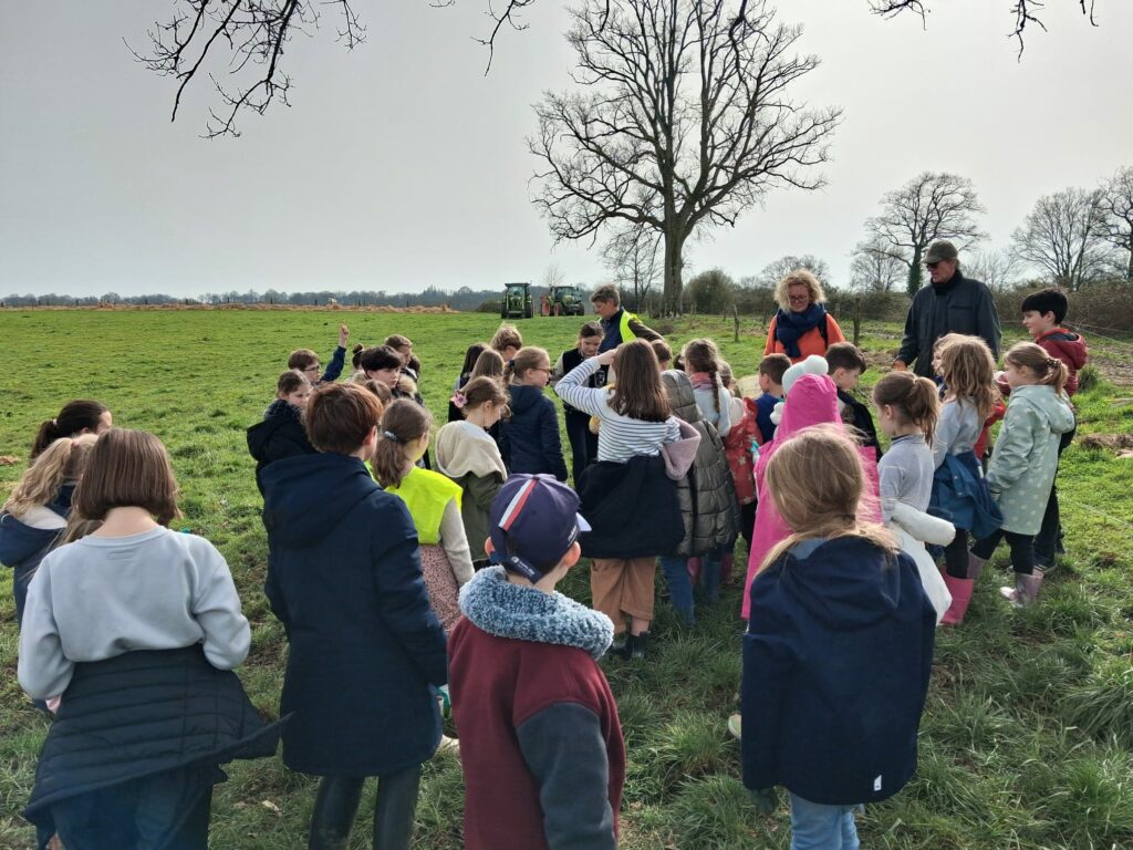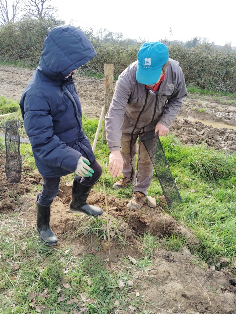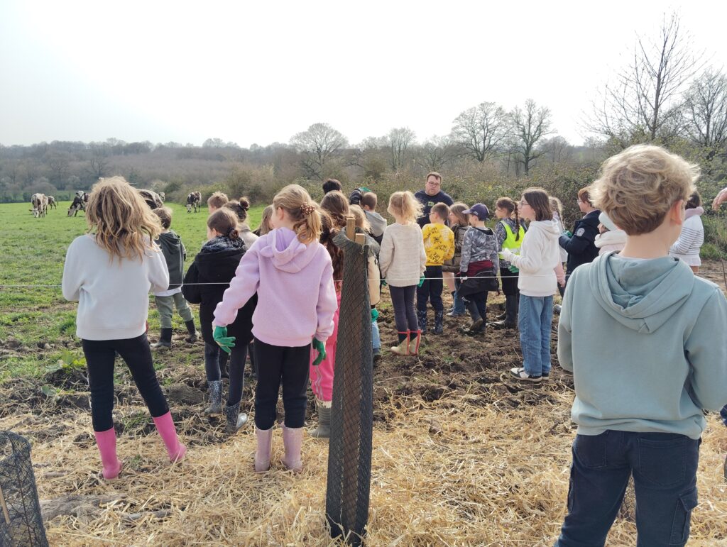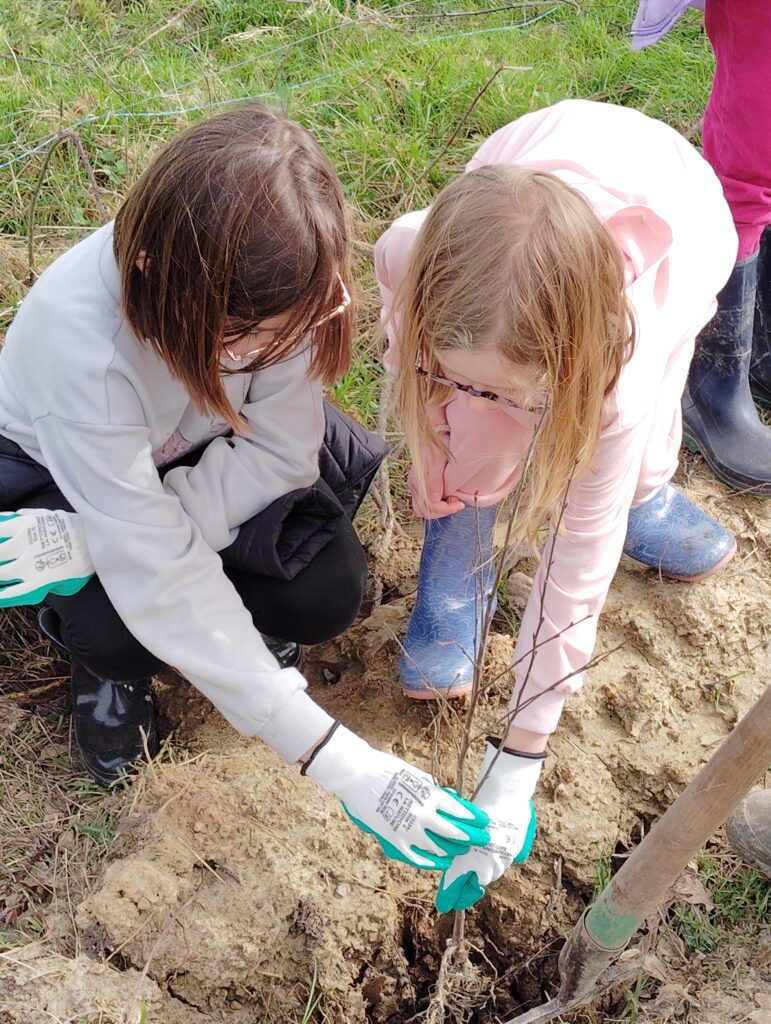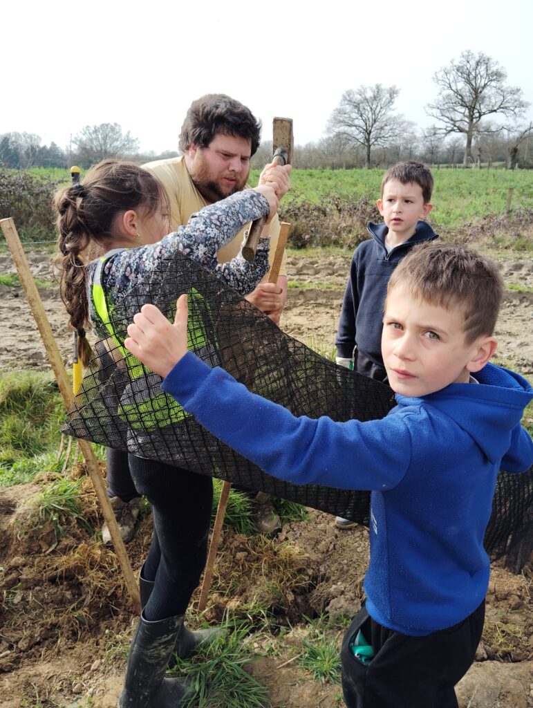 Les enfants de CE et CM ont été accueillis par la famille Gobé, aux Grandes Métairies, afin de planter une haie composée de différentes essences d’arbres : orme, frêne, châtaignier, aulne, merisier, bouleau, charme… Après avoir écouté les explications de Monsieur Gobé sur le rôle des haies, ils ont participé aux différentes étapes : mélanger les racines dans l’eau et la bouse de vache, véritable nutriment, creuser, planter, positionner le filet de protection contre les prédateurs et le fixer dans la terre avec les tuteurs…