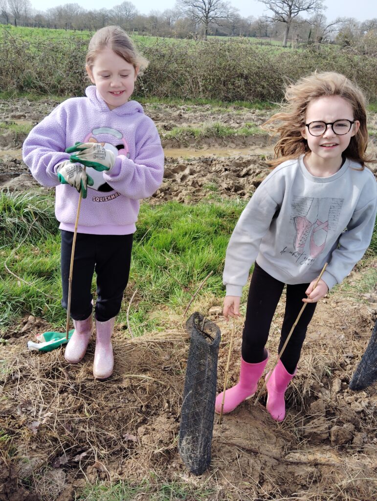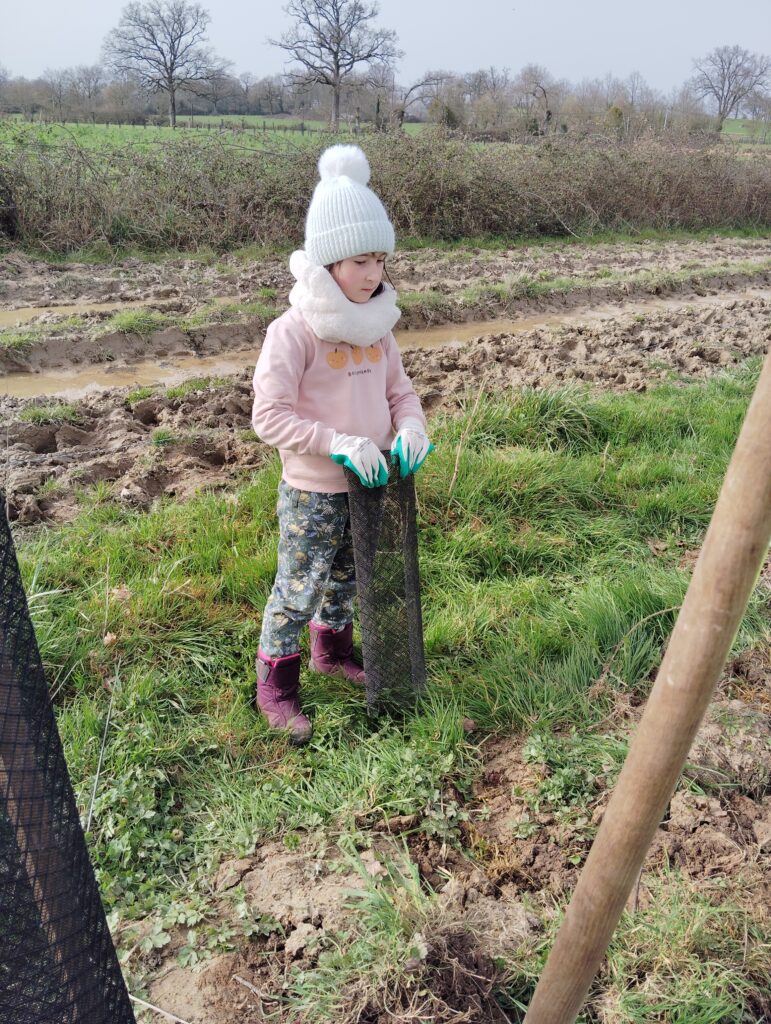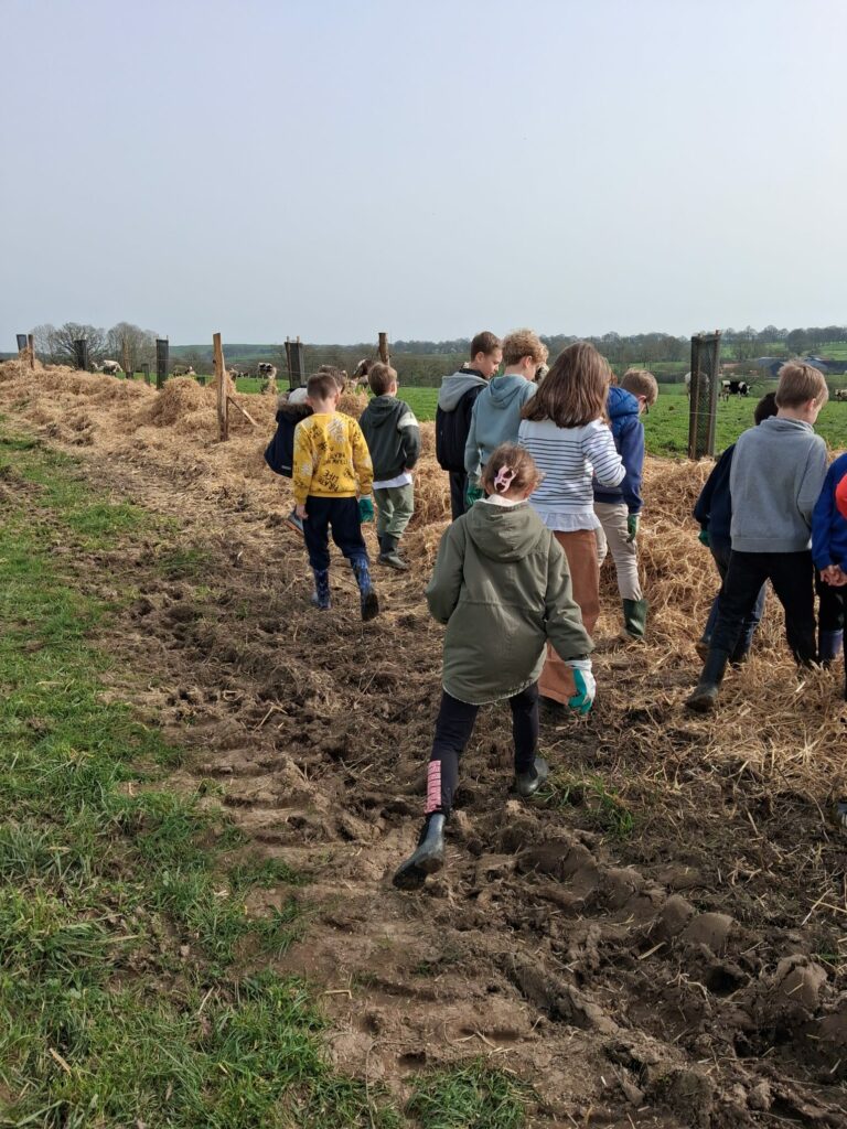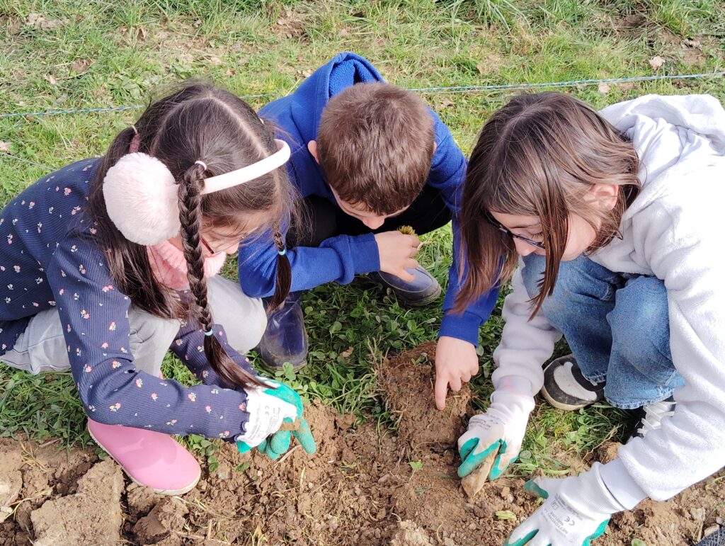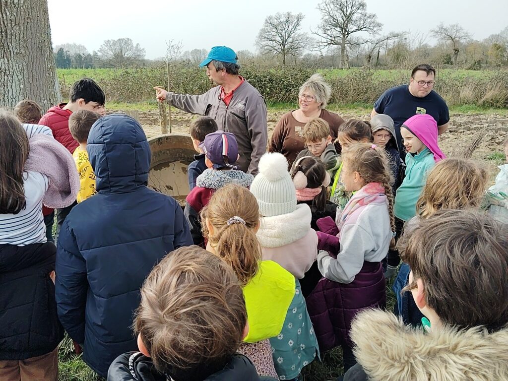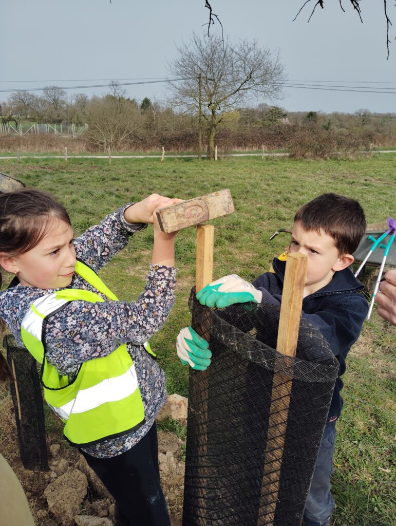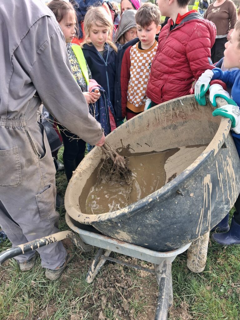 Les enfants de CE et CM ont été accueillis par la famille Gobé, aux Grandes Métairies, afin de planter une haie composée de différentes essences d’arbres : orme, frêne, châtaignier, aulne, merisier, bouleau, charme… Après avoir écouté les explications de Monsieur Gobé sur le rôle des haies, ils ont participé aux différentes étapes : mélanger les racines dans l’eau et la bouse de vache, véritable nutriment, creuser, planter, positionner le filet de protection contre les prédateurs et le fixer dans la terre avec les tuteurs…